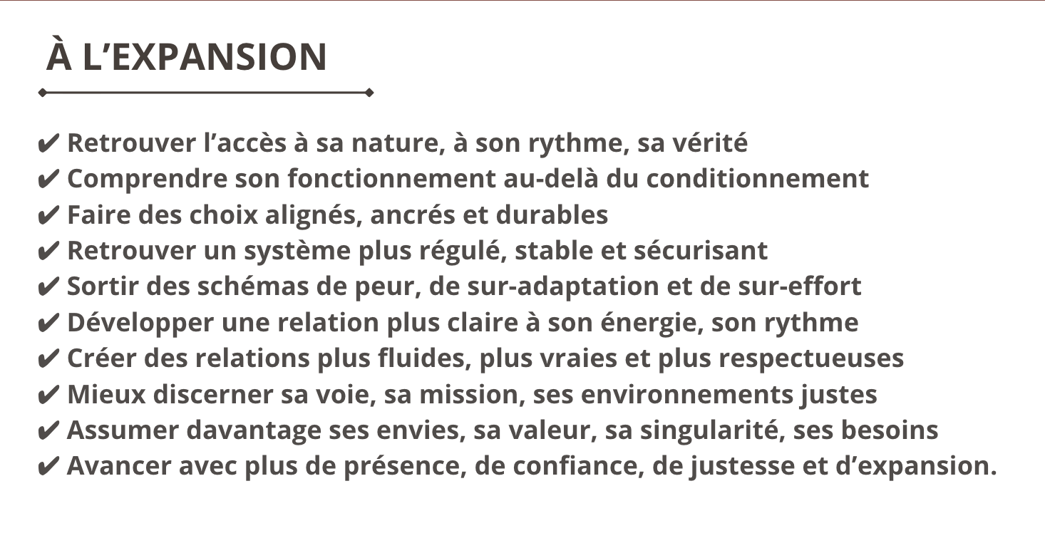 Parce que ce qui manque n’est pas toujours une solution de plus. C’est souvent un point de départ plus juste: VOUS. VOTRE NATURE. VOTRE FONCTIONNEMENT. VOTRE VÉRITÉ.